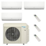 The Daikin 36,000 BTU 20 SEER2 Tri Zone Mini Split System offers efficient heating and cooling for three separate spaces with three indoor units 9,000 BTU + 15,000 BTU + 24,000 BTU. Perfect for homes or light commercial use, it features advanced inverter technology, quiet operation, and eco-friendly R-32 refrigerant. Enjoy independent climate control in each zone with a sleek wall-mounted design. System includes remote controllers, and a 12-year limited parts warranty.